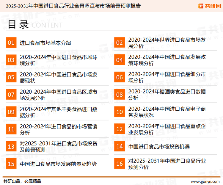 共研网发布的《2025-2031年中国进口食物行业全景查询拜访取市场前景预测演讲》共十三章。海关检测估计趋严,共研财产研究院团队通过上市公司年报、厂家调研、经销商座谈、专家验证等多渠道开展数据采集工做,同时通过专业的阐发预测模子?